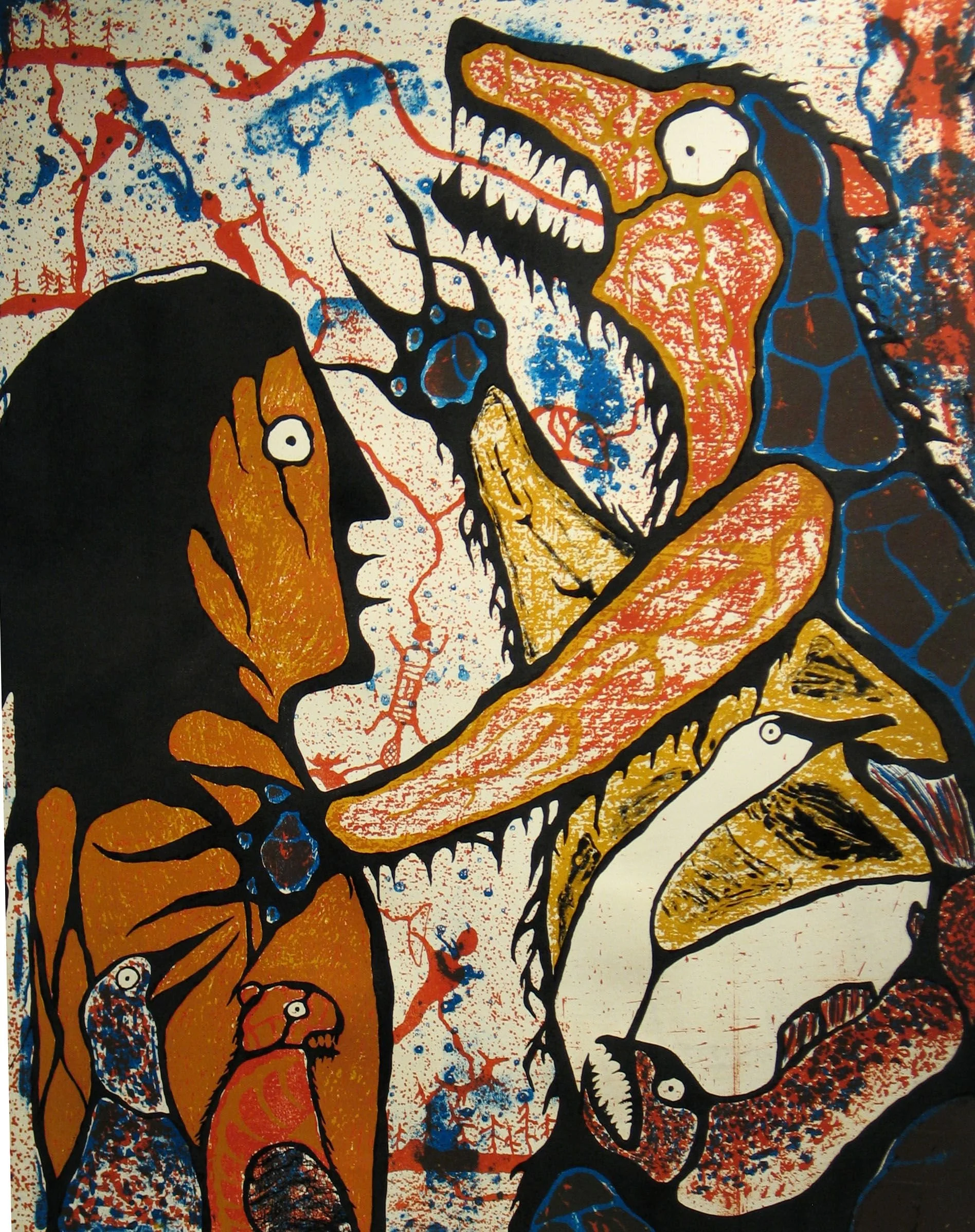 This exhibition features a traveling selection of work from the Missoula Art Museum Collection by printmaker Jason Elliott Clark. In his work, Clark explores Algonquin legends mixed with personal stories and misinformation about contemporary Native culture. The works in the exhibition focus mainly on Clark’s early career as a printmaker in the University of Montana’s MFA program (2004) and soon after. Clark says,"My work is rooted in the traditional teachings and beliefs of my ancestors and the erroneous teachings and beliefs of western society about Native Americans. The subjects portrayed in my art are from personal experiences and the legends of my Algonquin heritage. I am also interested in what people are being taught about Native Americans by western culture through parents, teachers, textbooks, films, television, cartoons, consumer advertisements, products, and other transmitters of misinformation. My work deals with subjects that I have observed or experienced firsthand. These are the stories that have shaped and formed my life. They illustrate how I see the world around me and how I have learned to respect it. The images and stores in my work are reflections or parts of me."The exhibition showcases numerous printmaking techniques including relief, lithograph, monotype, and screen printing.