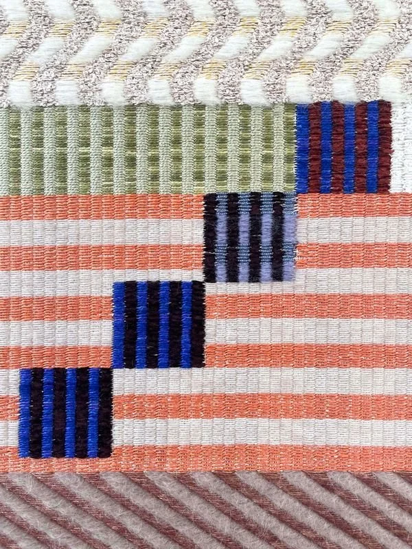 Presenting Windows & Doors by Bozeman artist Meghan Spielman. Meghan uses a variety of highly textural and contrasting yarns, such as silk boucle, chenille, mohair, and wool to create thoughtful and meticulous weavings. Meghan works in her home studio on a 32-harness computerized dobby loom. She aims to celebrate the boundaries of the loom and the inherent properties of the materials while using both intricate patterns and her own improvisation to build eye-catching compositions. This series speaks to the historical iconography of American coverlets and quilts. She is considering and reacting to our complex relationship with domestic craft heirloom objects. Referencing Eliza Calvert Hall’s “A Book of Hand-woven Coverlets” published in 1912, Meghan found inspiration in the wide variety of hand-woven patterns prevalent in America at the time. One of which, called “Windows and Doors” is defined by a simple arrangement of blocks, or a reduction of the classic checkerboard grid. By using classic geometric shapes and exaggerating their size and structure, Meghan achieves a modern take on a classic textile. Alissa Kost, Executive Director of MAGDA, states,‘Meghan’s work is comfortable and complicated at the same time. It draws you in and invites you for a cup of tea while also making you question your outfit choices. Her work celebrates the history of the American quilt while rejuvenating and amplifying the potential of each fiber. It is a beautiful dance of culture and contemporary art unlike any I have seen before.’